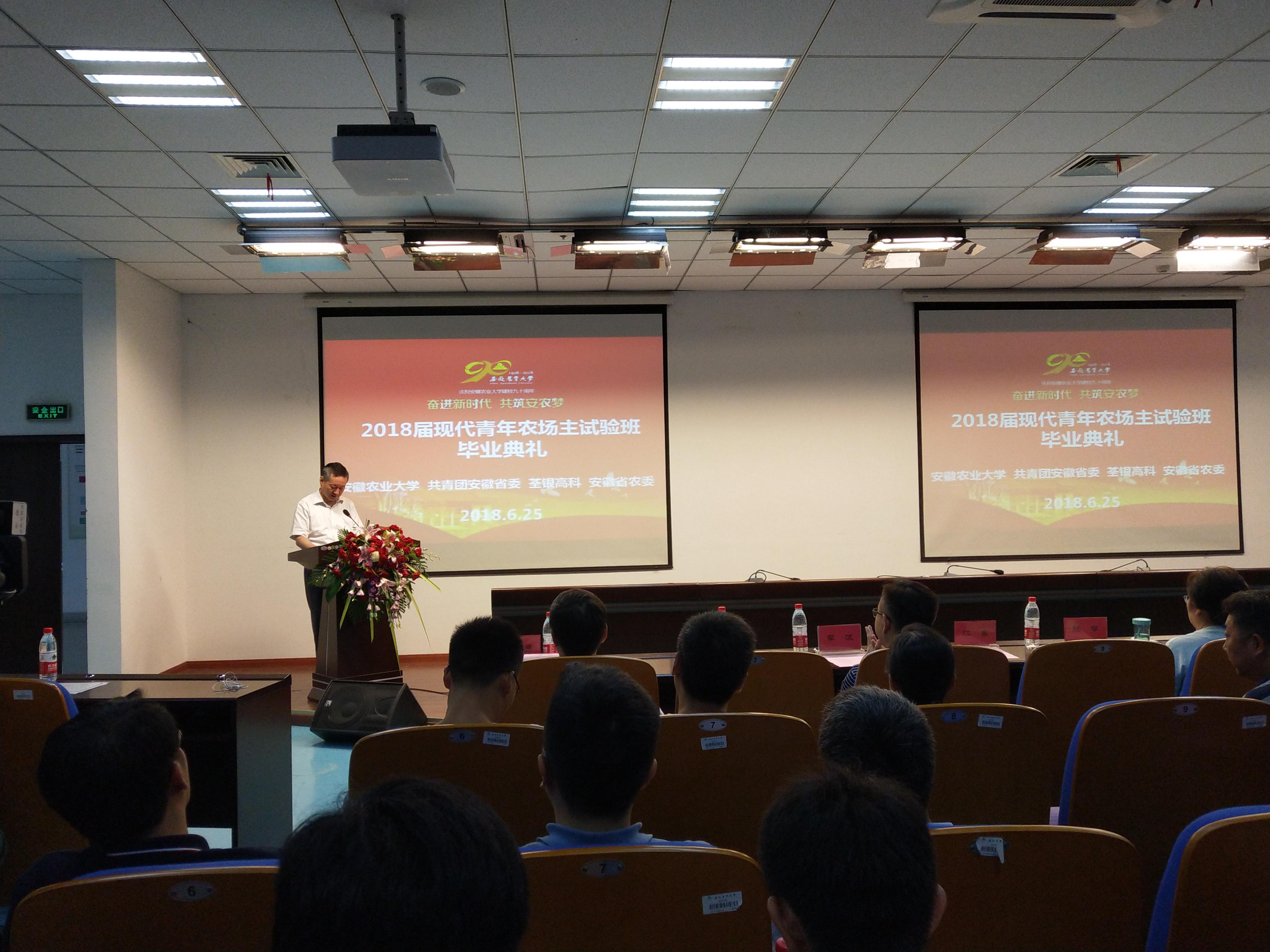 ??? 2018年6月25日上午,2018屆團(tuán)校企“現(xiàn)代青年農(nóng)場主”荃銀創(chuàng)新創(chuàng)業(yè)試驗(yàn)班畢業(yè)典禮在安徽農(nóng)業(yè)大學(xué)舉行。安徽農(nóng)業(yè)大學(xué)黨委書記江春,共青團(tuán)安徽省委員會(huì)副書記李波、荃銀高科董事長張琴出席畢業(yè)典禮。安徽農(nóng)業(yè)大學(xué)副校長馬傳喜主持畢業(yè)典禮。巽風(fēng)湖創(chuàng)業(yè)孵化基地總經(jīng)理佘良東、荃銀高科定遠(yuǎn)創(chuàng)業(yè)孵化基地負(fù)責(zé)人羅干以及安徽農(nóng)業(yè)大學(xué)相關(guān)處室、學(xué)院等單位主要負(fù)責(zé)人、部分現(xiàn)代青年農(nóng)場主試驗(yàn)班的任課老師、2018屆現(xiàn)代青年農(nóng)場主試驗(yàn)班畢業(yè)生、2015級和部分2016級現(xiàn)代青年農(nóng)場主試驗(yàn)班學(xué)員參加了畢業(yè)典禮。